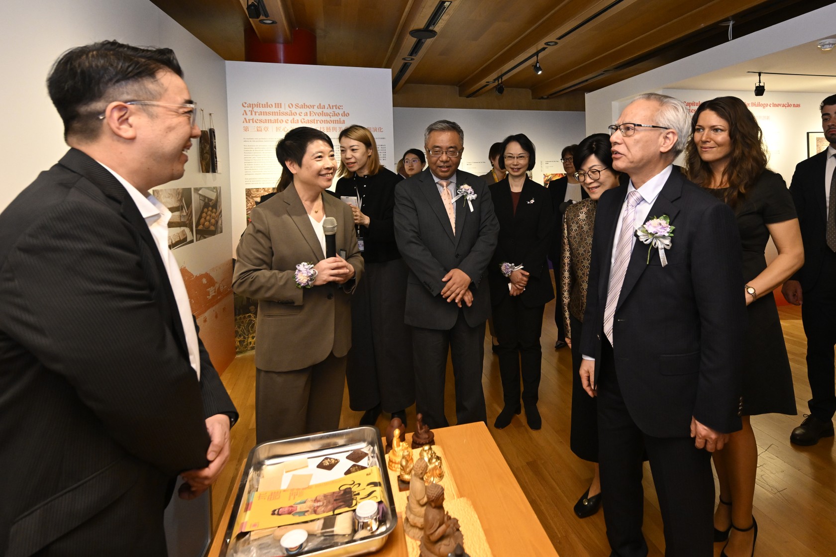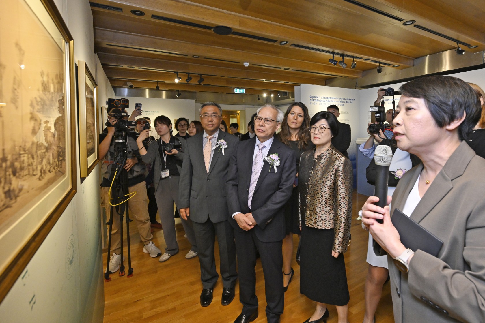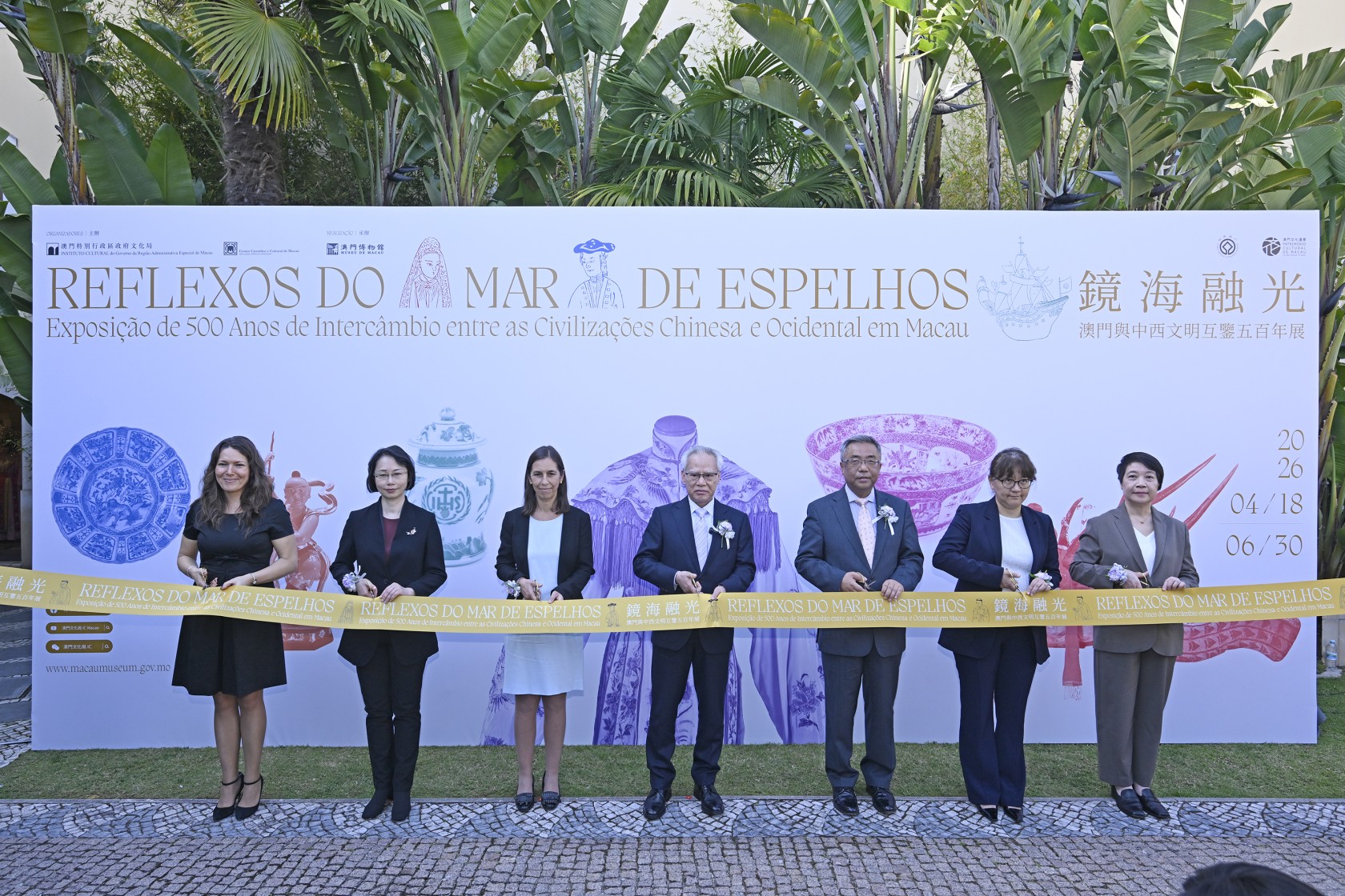 行政長官岑浩輝、葡萄牙科學與創新國務秘書海倫娜‧卡尼奧(Helena Canhão)及中國駐葡萄牙大使楊義瑞等,為特區政府文化局與葡萄牙澳門科學文化中心合辦的“鏡海融光:澳門與中西文明互鑑五百年展”主禮開幕儀式。